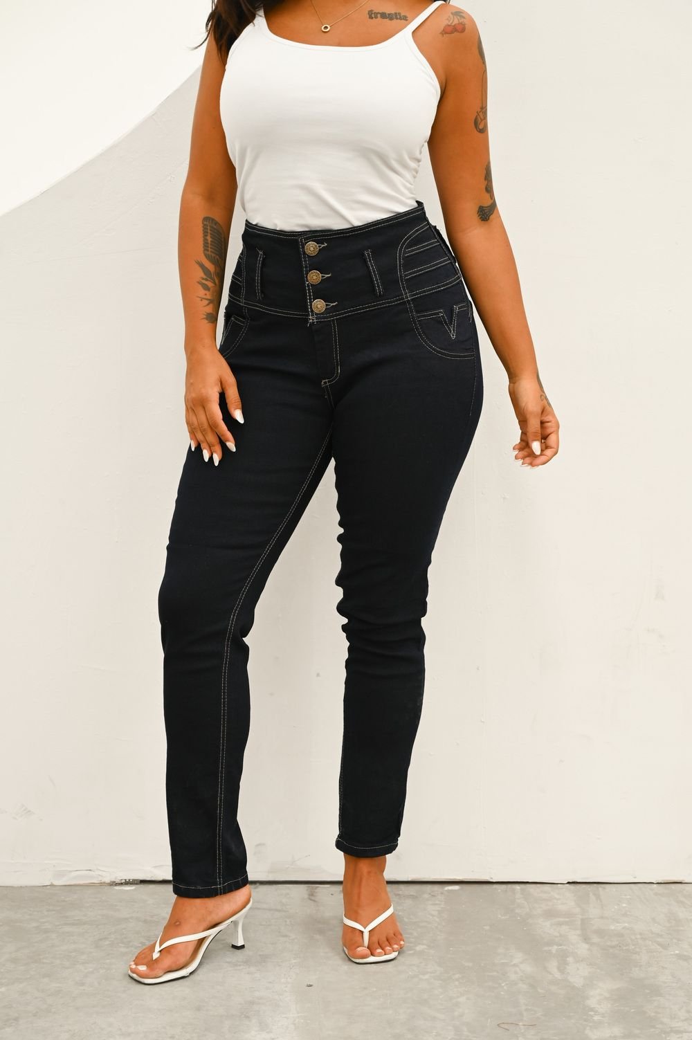 Jean tiro alto con faja súper elastizado.