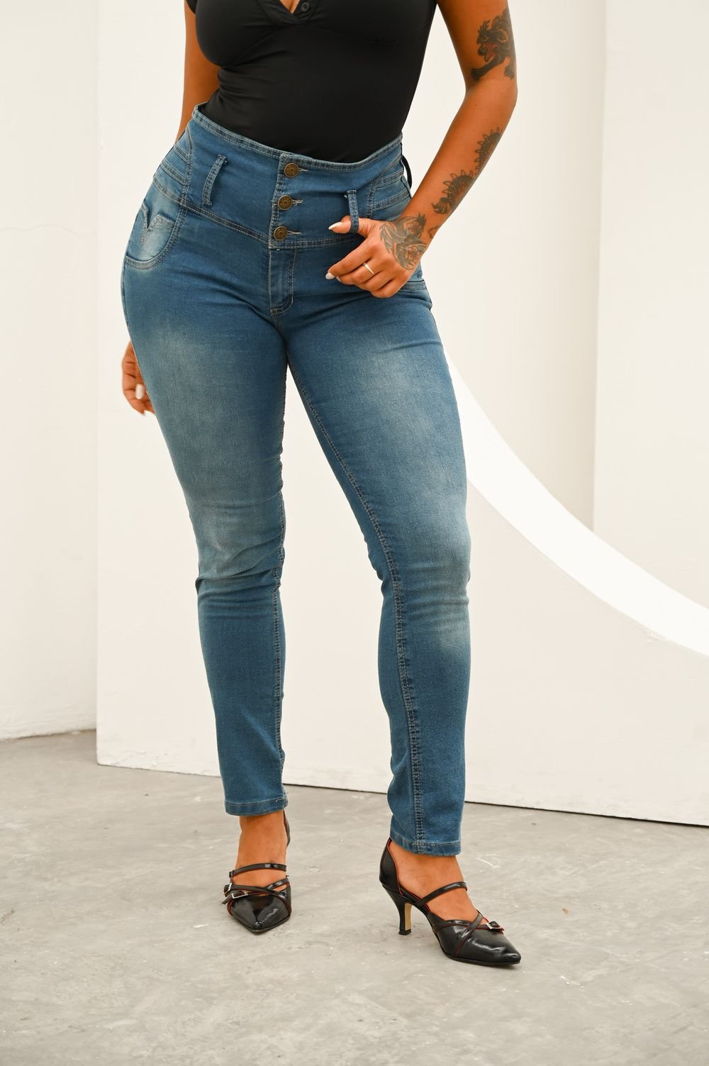 Moldería: Normal (talles reales)/Tiro: Alto/Fit: Chupín/Lavado: Azul localizado
